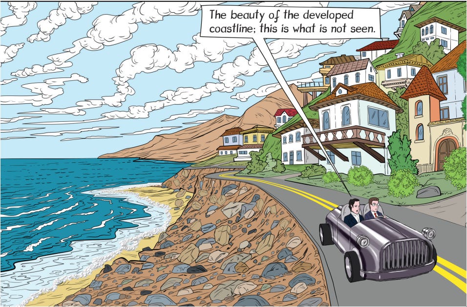 The epiphany that convinced me to write Build, Baby, Build: Instead of trying to argue people out of their aesthetic pessimism, I should use the graphic novel format to fight aesthetics with aesthetics — to show readers the beautiful unseen world that government forbids. And that’s why the fifth chapter of the book resurrects the great Bastiat as a co‐narrator.