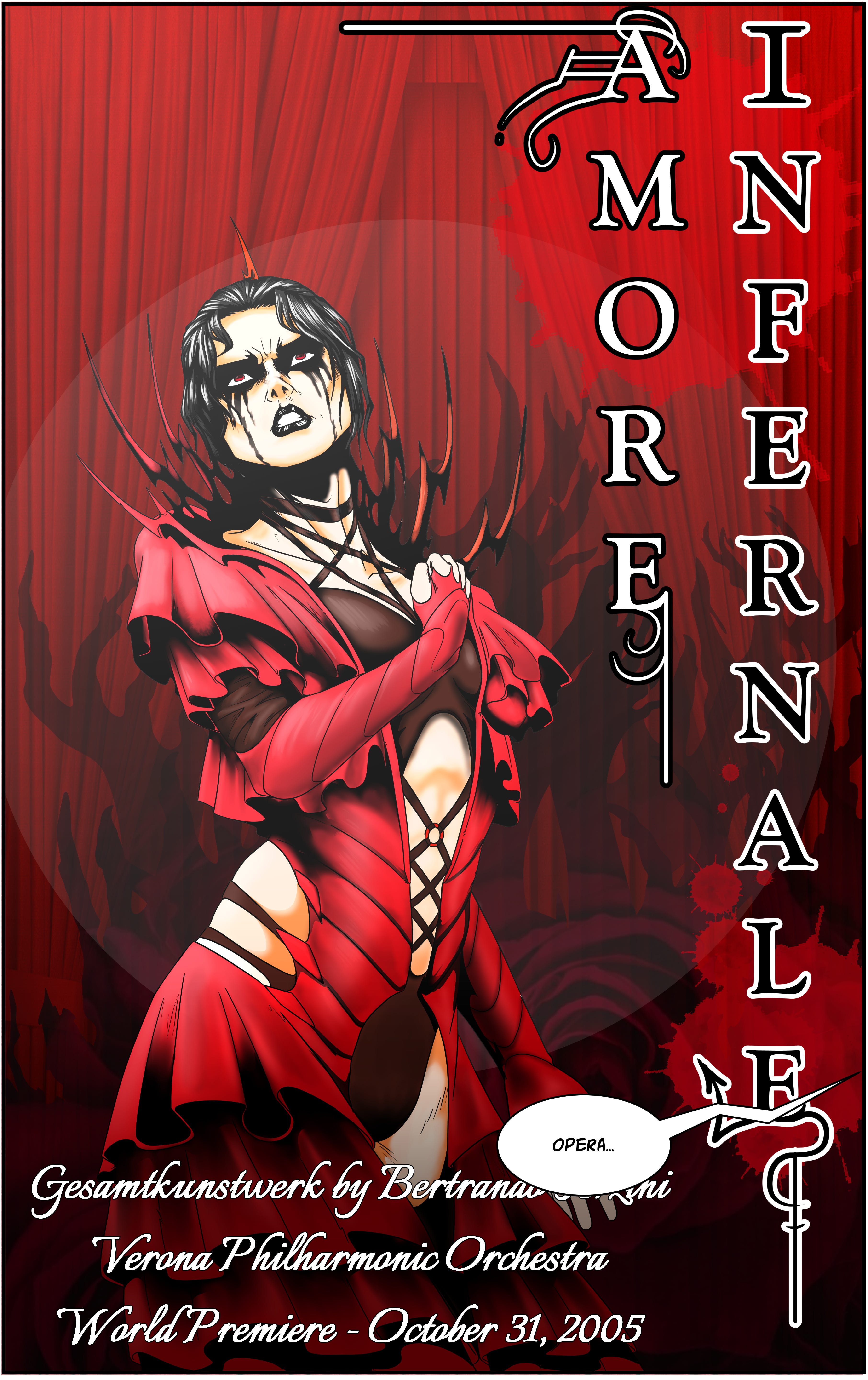 I like stunning representational art. In the attached files, you can see some of my previous favorite attempts to illustrate *Amore Infernale*. I also favor traditional color schemes, the kind you'll see in Tintin or P. Craig Russell's *Ring of the Nibelung* adaptation. Even more importantly, though, I love art with a passionate vision. If you're ever in artistic doubt, remember that my favorite composer is Richard Wagner!