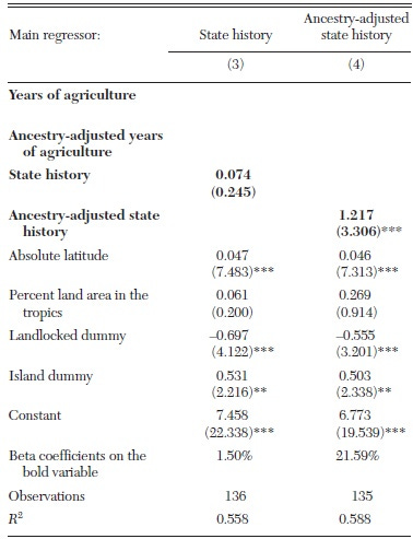 Both sets of regressions reinforce the lessons of Putterman and Weil: ancestry and geography are both big deals. If I’m correctly applying SW, though, they find a smaller effect of ancestry and a larger effect of geography, presumably because they add the “Island” variable. An extra 10,000 years of ancestral agriculture boosts expected per-capita income by 269%. But moving 25 degrees from the equator has the same effect. And moving from a landlocked country to an island at the same latitude boosts per-capita income by 343%!