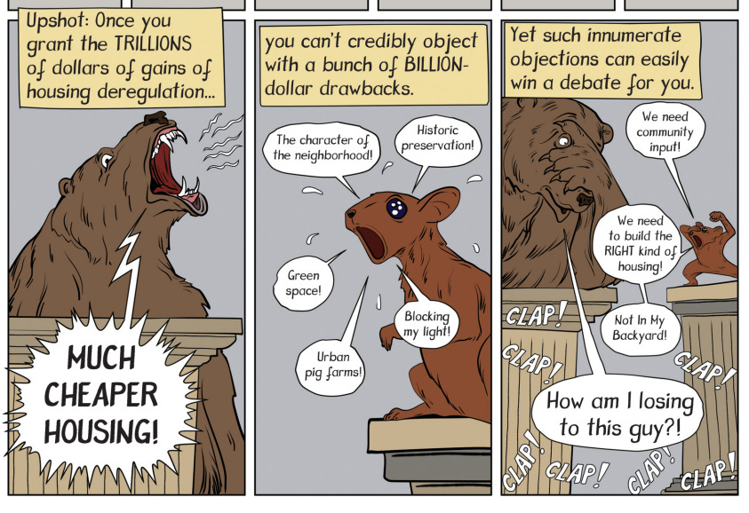 “When the bear says, ‘How am I losing to this guy?’ Yeah, that’s me,” Caplan says. The major benefits of lower housing costs can be drowned out by concerns that ought to matter less.