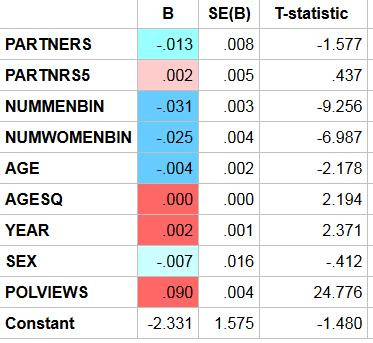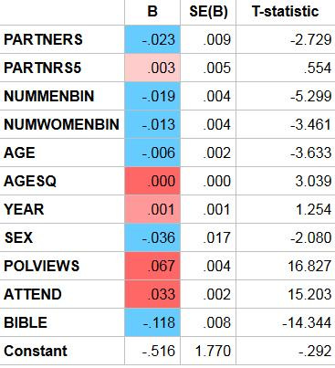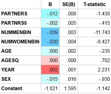Regressing abortion views on sexual partners, age, age squared, year, and sex: