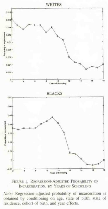 Empirically distinguishing human capital from signaling is notoriously tricky, but sheepskin effects – discrete benefits from crossing academic finish lines – are a strong symptom of signaling. Sheepskin effects for income are enormous. Are there comparable sheepskin effects for crime? The literature is sadly thin. But these figures from Lochner and Moretti‘s influential 2004 AER piece reveal big sheepskin effects of high school graduation on incarceration, with graduation year providing roughly 2/3 of the benefit.