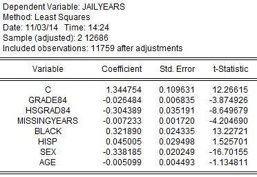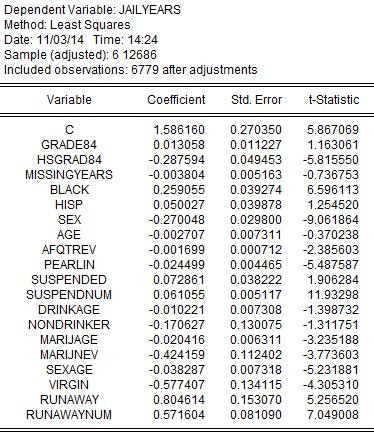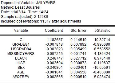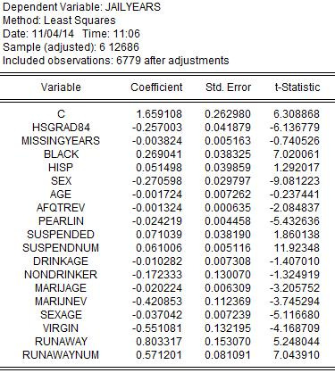 Of course, the criminogenic effect of years of education is neither statistically significant nor plausible. What happens if we simply discard years of education as a control variable? Then the baseline regression becomes: