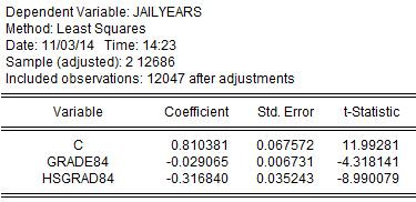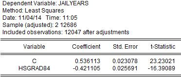 Are appearances revealing? I decided to see for myself in the NLSY. For convenience, I only look at the discrete effect of high school graduation, and equate “high school graduate” with “finished 12th grade.” My measure of crime continues to be the total number of times the respondent was interviewed in jail.