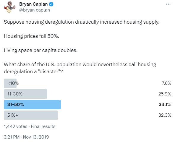Isn’t that an absurd view? So it might seem – until you realize that much of the population rents, but only a tiny minority of the population sees housing regulation as a problem. Deeper research confirms that renters strongly oppose deregulation, too! Since tenants are plainly deluded on this, why is it so hard to believe that homeowners are deluded as well?