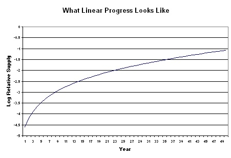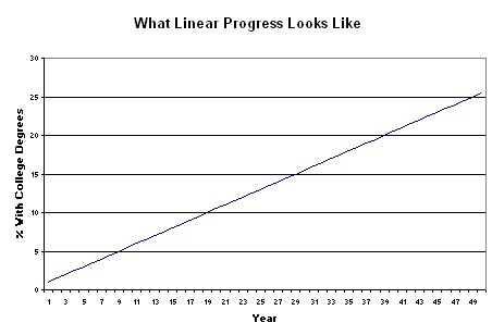 Last point: Using the Goldin-Katz measure, even straight-line progress implies relative stagnation. Imagine a society where the fraction of the population with college degrees starts at 1%, and rises by .5% per year. Here’s educational attainment over the course of 50 years: