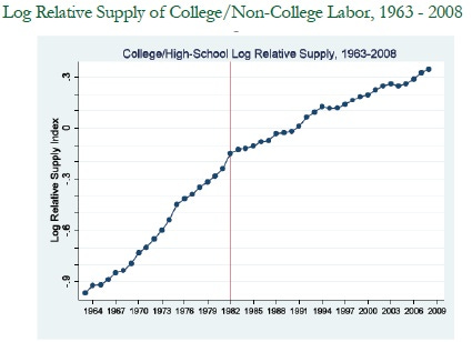 But if stock is the right measure of labor supply, how can Goldin-Katz explain the sharp increase in the college premium? Their story is that the college premium rose because educational attainment is rising at a slower rate than it used to. Katz sent me a figure to illustrate: