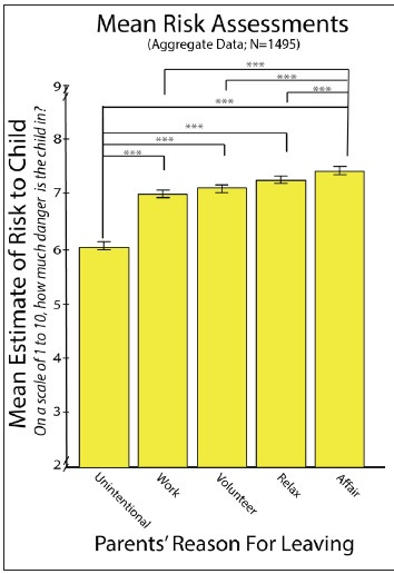 In reality of course, children who are left alone in circumstances approved by their parents are likely to be safer than children who find themselves alone by accident, because parents can take steps to ensure their child’s well-being in their absence (e.g., making sure the baby is securely buckled into a car seat; that the car is parked in a shady spot; that an older child has a cell phone, knows when to expect the parent back, etc.) The fact that participants considered children left alone by accident safer than those left alone on purpose strongly suggests that participants’ moral condemnation of parents skewed their risk estimates.