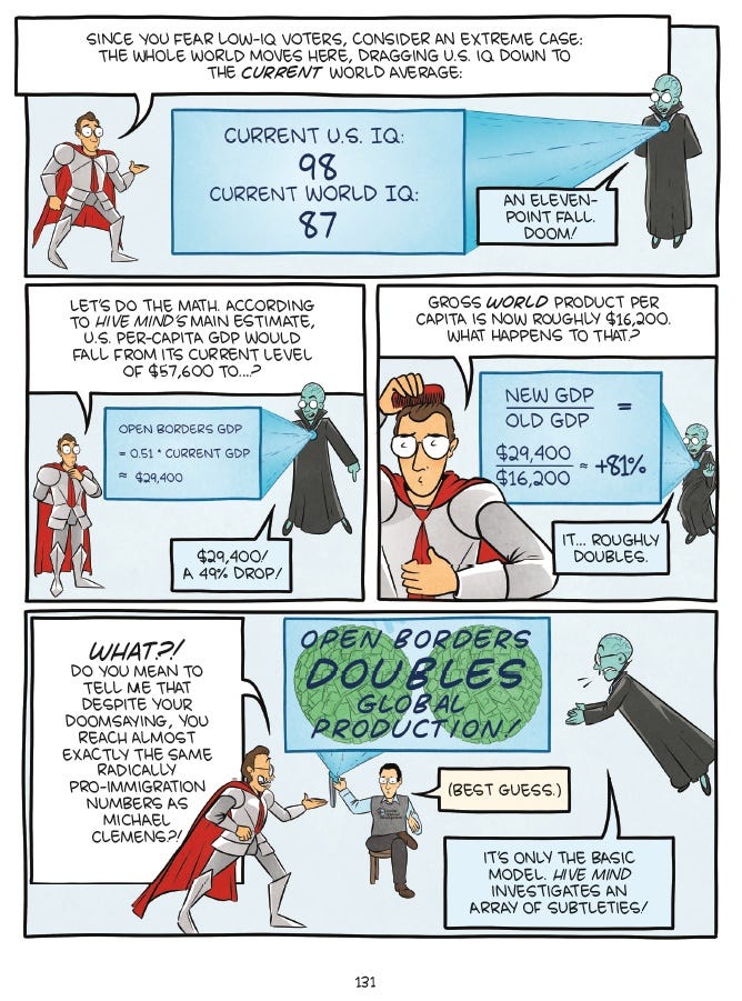5. Caplan and Weinersmith’s new Open Borders: The Science and Ethics of Immigration used Hive Mind‘s preferred estimates to run a little thought experiment: What would happen if everyone on Earth moved to the U.S., bringing our national IQ down to the global average? The result: Global output still roughly doubles. Here’s the key page, featuring me as a virtue-signaling knight debating a Jonesian alien:
