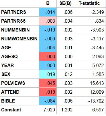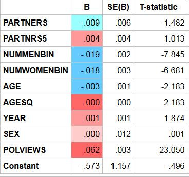 Left-right ideology remains the strongest predictor, but both religious measures are comparably important. The coefficients on sexual activity are miniscule by comparison. Moving from a moderate Christian to a fundamentalist Christian view of the Bible has a bigger effect than moving from 0 to 100+ lifetime sexual partners.