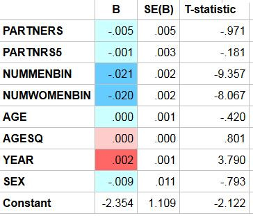 So what happens if we regression ABORTION on a constant, all four measures of sexual activity, age, age squared, year, and SEX (=1 if male, =2 if female)?