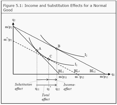 When the price of q1, p1, changes there are two effects on the consumer. First, the price of q1 relative to the other products (q2, q3, . . . qn) has changed. Second, due to the change in p1, the consumer’s real income changes.