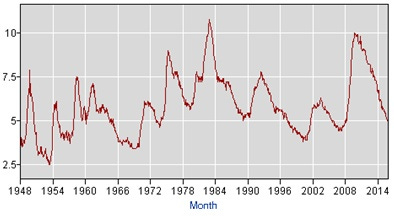 The far view that guided my bet is rooted in the following graph for U.S. unemployment rate from 1948-2016.