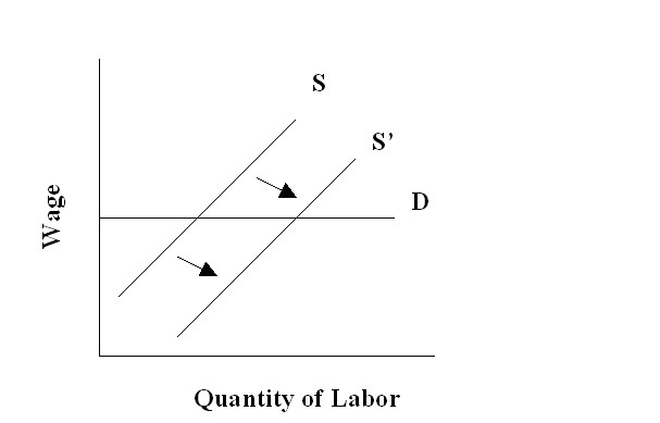 Notice: When the Supply curve shifts out, the quantity of labor sold increases, and wages stay the same.