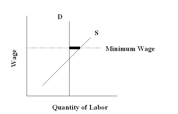 In turns out that Card and Krueger’s results are theoretically possible too. All that is necessary, as Figure 2 shows, is that labor demand be infinitely inelastic, i.e., vertical. (The thick horizontal line between S and D at the controlled price is a labor surplus, but note that the quantity of labor purchased remains unchanged).