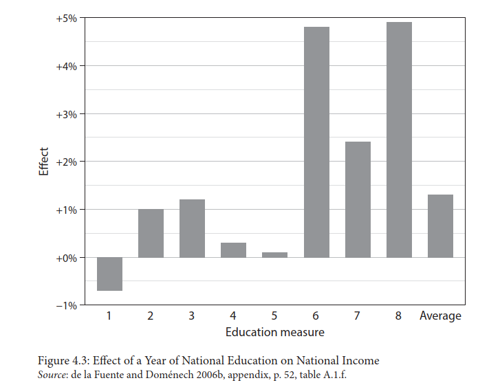 Fortunately, after voracious but frustrating reading on the topic, I eventually hit pay dirt when the noble Ángel de la Fuente graciously emailed me an amazing appendix to his 2006 paper with Rafael Doménech. In this appendix, they estimate the same Macro-Mincer regressions on 8 (!) different data sets for the same 21 OECD countries. Their overall results: