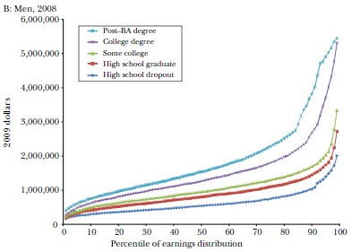 What’s equivocal? Although the 2008 graph definitely has more inequality, the 2008 labor market consistently offers more continuous rewards for achievement. In 1978, “some college” was rarely more lucrative than “high school only,” and “post-BA degree” was rarely better than “college degree.” The two lines virtually overlap until the 80th percentiles. In 2008, in contrast, the marginal payoff for jumping up a single educational category is visible throughout the entire distribution.