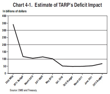 If you don’t wish to download a 510-page pdf, try the CBO’s 8-page summary of the OMB report, combined with the CBO’s slightly different (but still negative) estimates of TARP’s budgetary costs.