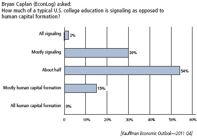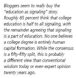 My confidence in the empirical importance of the signaling model of education generates a lot of pushback from my fellow economists. For starters, see my arguments with Bill Dickens, Tyler Cowen, Karl Smith, and Arnold. Which got me wondering: How alone am I?