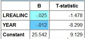 It’s a common view, but is it true? I decided to check with the General Social Survey. On the surface, there’s a marginal case that Betsey’s right. Results from a regression of number of children on log income and a year trend: