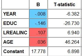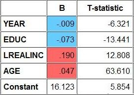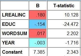 The main problem with regressing anything on income, though, is that income, education, and IQ are all highly intercorrelated. Like look-alike siblings, income, education, and IQ endure endless mistaken identity issues. So what happens if we run a horse race? Results from a regression of number of children on log income, years of education, a ten-question IQ test (WORDSUM), and a year trend: