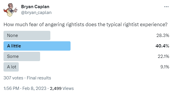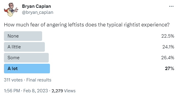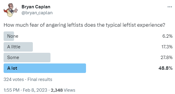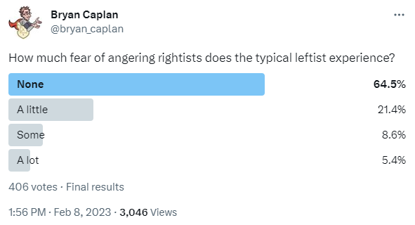 I wonder if this applies mostly to people in academia or other similar institutions? The lefty people I know out in the real world seem blissfully blind to cancel culture and the excesses of the left. When I bring up extreme things that are pretty mainstream among elected Democrats they look at me like I'm crazy. I think they put climate and gender extremism and 1619 project stuff in the same category as crazy right wing theories about pizza shop pedo rings. But then who knows, maybe I'm the one in the bubble.