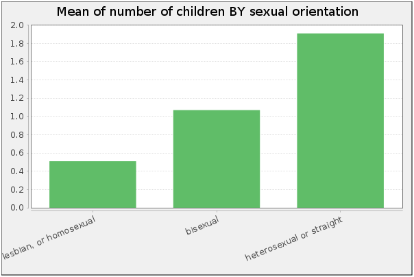 The simplest response is to doubt that sexual orientation matters much for fertility. Do we really know? Google Scholar is strangely silent on this issue, but the General Social Survey asks all the required questions to reach an answer. Its fertility question, CHILDS, is pretty clearly about biological children: