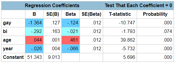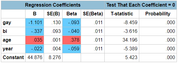 However, the General Social Survey currently runs from 1972 to 2021. During this time, age-adjusted fertility crashed and non-straight identity skyrocketed. Both long-run trends potentially distort the results. What if we statistically control for both age and year? Here are the regression results for males: