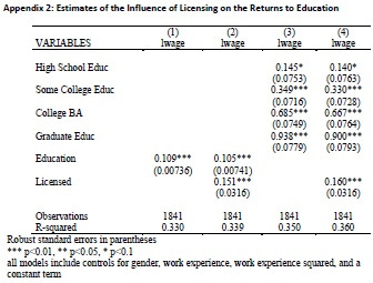 Still, the question remains: How much of the return to education is a disguised licensing premium? Kleiner and Krueger create a brand new data set that allows them to directly answer this question. Even though they find a large licensing premium, they conclude that licensing only mildly inflates the return to education. Their results: