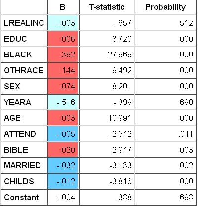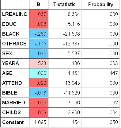 The simplest explanation for my small estimates is that I’m controlling for church attendance and Biblical literalism. If you drop these controls, marriage and children matter quite a bit more. All things considered, though, the religious controls seem appropriate. Religious belief, religious observance, marriage, child-bearing – these are all reflections of underlying traditionalism – and that’s probably what’s driving the results.