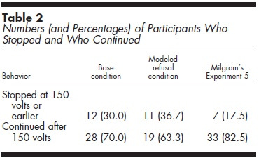 The percentage of participants who continued the procedure after pressing the 150-volt switch was examined. As shown in Table 2, 70% of the base condition participants continued with the next item on the test and had to be stopped by the experimenter. This rate is slightly lower than the percentage who continued beyond this point in Milgram’s comparable condition (82.5%), although the difference fell short of statistical significance…