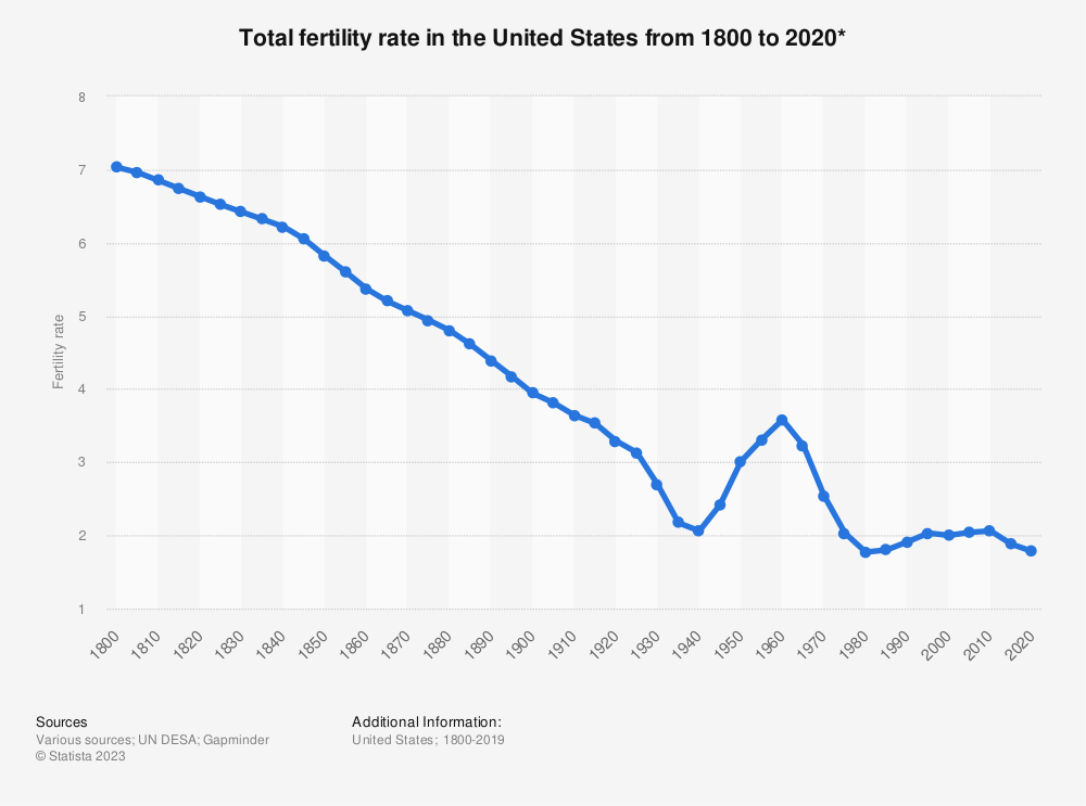 During the Great Depression, America’s Total Fertility Rate crashed. In 1940, TFR dipped below the standard replacement rate of 2.1 for the first time. Then, without warning, this trend reversed. The U.S. entered the famous Baby Boom. Over the next two decades, TFR almost doubled.