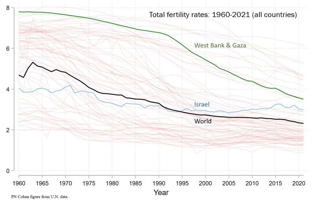 Or consider family size in Israel and Palestine. Their economies differ radically: Israel is rich, Palestine is poor. Their policies differ radically: Israel funds piles of pro-natal subsidies, while Palestine’s de facto governments have lower combined cash flow than any one of Israel’s top ten corporations. Religiosity, too, differs radically: While both countries have plenty of fundamentalists, Israel has a large secular contingent that is virtually invisible in modern Palestine. Nevertheless, women in both countries have piles of kids. Once again, the conformity story fits: Israeli women conform to the big family Israeli norm; Palestinian women conform to the big family Palestinian norm. Result: Despite radically different situations, both peoples are extraordinarily fertile.