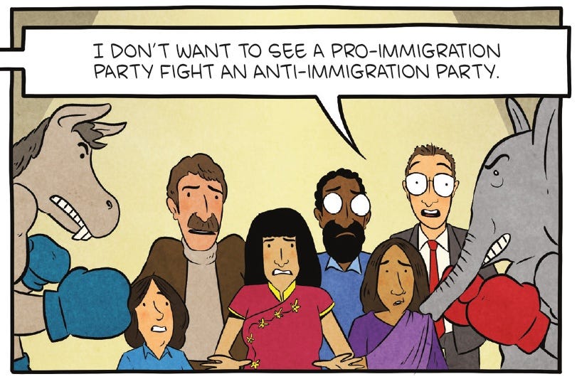 I hope this pattern of reactions to my books continues. I fear, however, that I’ve reached the end of the line. Immigration has become so ideological during the last five years. Pessimism about immigration is almost a litmus test for conservatism. Yet there is no fundamental reason for this change of heart. Yes, today’s immigrants are heavily Democratic. As I explain in the book, however, this is a recent pattern. During the Reagan era, immigrants were almost equally divided between the two major parties.