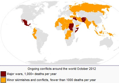 The ceaseless ugliness of the news notwithstanding, the Great Pacification continues. Check out Wikipedia’s latest map of Ongoing Military Conflicts, circa October 2012.
