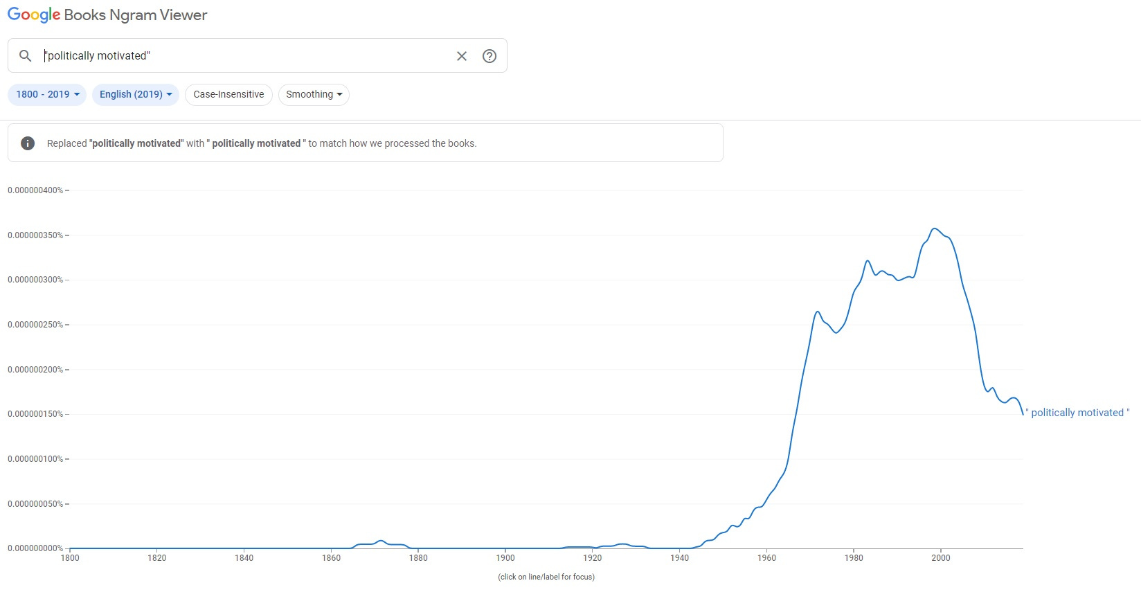 * According to Google’s Ngram, the “politically motivated” meme has sharply declined since its peak in 1998, but remains at historically very high levels.