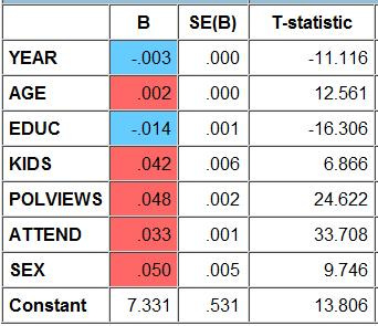 But throwing in more variables sheers the effect of parental status – and gives us better yardsticks for comparison. Here’s what happens if you add controls for ideology, church attendance, and gender: