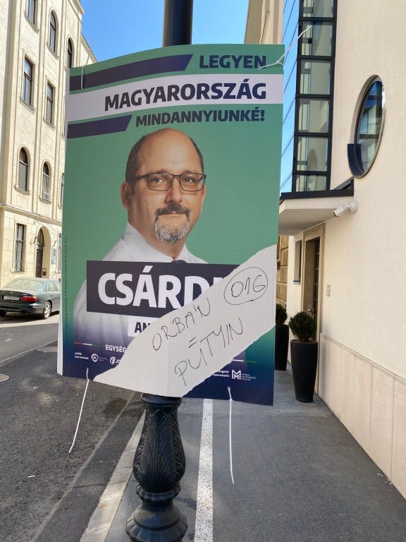 5. I arrived two weeks before yesterday’s Hungarian election. The main opposition parties banded together to beat Victor Orban, but betting markets predicted they would fail. After I saw the opposition propaganda, my reaction was: "No wonder." You'd think Orban's enemies would seize on this golden opportunity to denounce the Great Illiberal Democrat as the Hungarian Putin; or better yet, to mock him as Putin's puppet, pet, lover, or stooge. Instead, the opposition posters were boring portraits with banal slogans. (Though in my neighborhood, a few opposition signs were fraternally vandalized to add "Orban=Putin" messages).