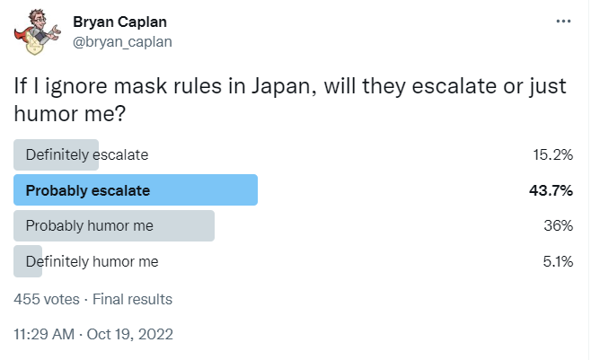 As you may have heard, 90-95% of natives still mask outdoors. Before I left, I ran this Twitter poll.