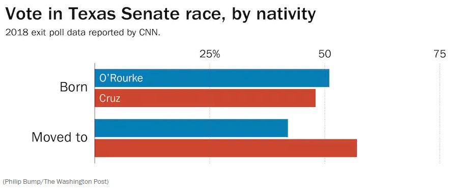 15. Lots of Texans I talked to fretted that non-Texan migrants from the rest of the United States were “turning Texas blue.” The “killing the goose that lays the golden eggs” meme came up occasionally: California leftists migrant to Austin for the opportunities, then vote for policies that ultimately make those opportunities dry up and blow away. The true story seems more complicated; my friend Ben Powell pointed out that in the so-called “canary in the coal mine” Beto-Cruz senatorial race, voters born in Texas were actually more Democratic than voters born elsewhere. Check it: