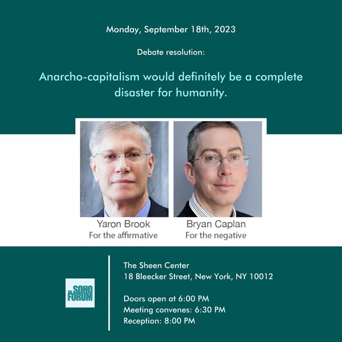 Thanks to everyone who attended Monday’s debate, and a special thanks to Gene Epstein for running the Soho Forum. By the power of Gene, I’ve done a total of four Soho debates: the robot domination debate with Robin Hanson, the defund college debate with Ed Glaeser, the Covid immigration debate with Mark Krikorian, and now the anarcho-capitalism debate with Yaron Brook.