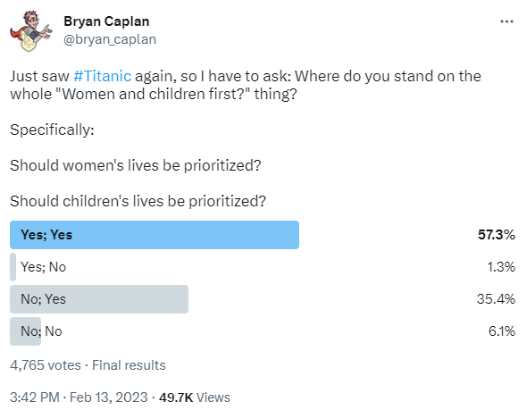 If the “women and children first” norm seems obsolete, it still commands wide adherence. Despite self-selection, it still won a supermajority in a Twitter poll I ran: