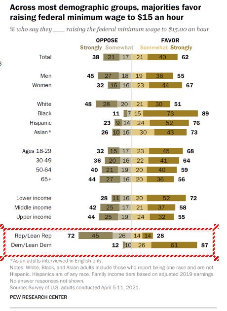 Namely: The latest data shows that rank-and-file Republicans have, at long last, turned on the minimum wage! A February 2021 Politico poll finds that only 34% of Republicans favor raising the minimum wage to $15, with 59% opposed. Subtracting out the undecided leaves 37% in favor versus 63% opposed. A Pew poll from two months later finds an even stronger result: