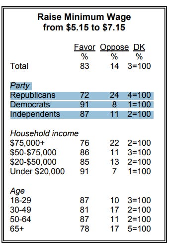 Admittedly, Politico also found that most Republicans still favor raising the minimum wage to $11. Subtracting out the undecided Republicans yields 60% pro, 40% con. For Democrats, though, the breakdown is 90%/10% - a 30 percentage-point gap.