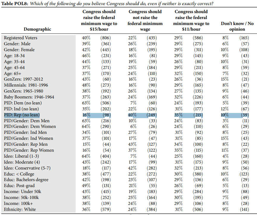 Furthermore, presented with three options - no increase, $11, or $15 - “no increase” is the most popular Republican answer. Subtracting out the undecided, 44% of ordinary Republicans now select “no increase” as their first choice.