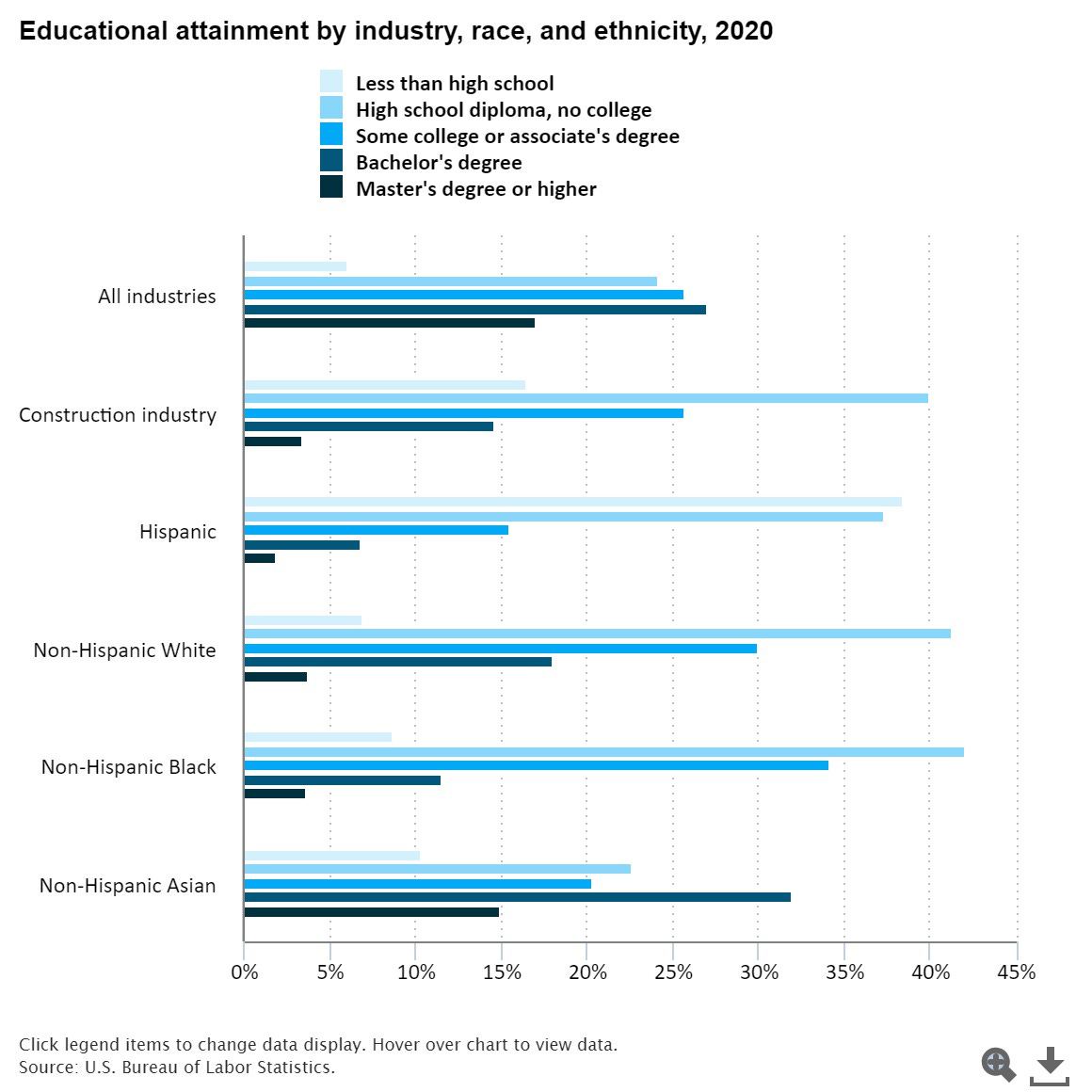 What makes me so sure that housing deregulation would be great for non-college males? Because non-college males build almost all our housing! Over 80% of all construction jobs are non-college already - and almost 90% are male. Via the U.S. Department of Labor Statistics: