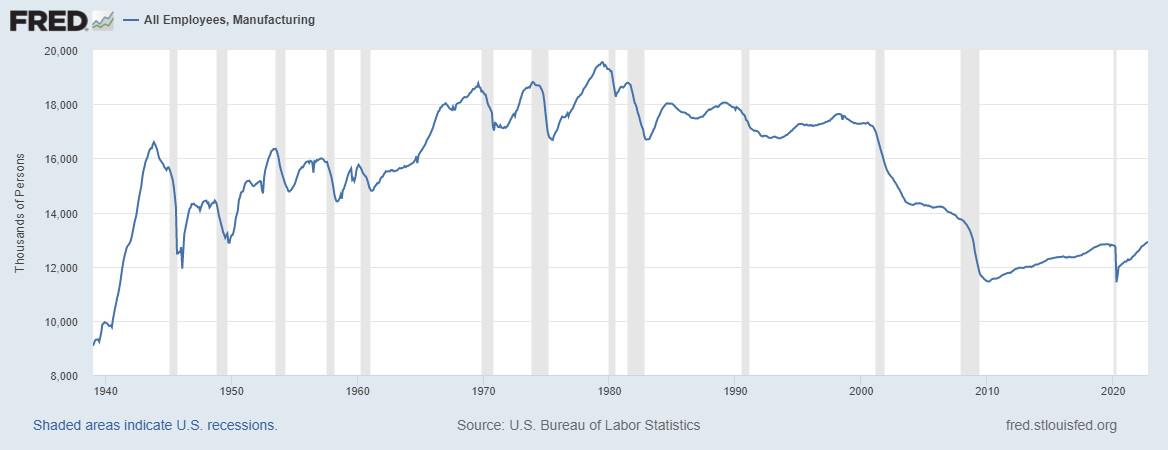 To create millions of new factory jobs would require truly draconian protectionism. Why? Because you’re fighting against not just global competition, but technological progress itself. Technological progress in agriculture has given us so much food that we no longer need many farmers. Technological progress in manufacturing has given us so much stuff that we no longer need many factory workers.