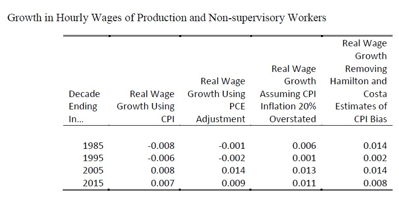 The next three columns calculate growth in real wages using a) PCE adjustment, b) an assumption of 20% upward bias in CPI growth, and c) Hamilton/ Costa adjustment to CPI. The picture looks progressively more optimistic as we move from left to right. PCE adjustment still has negative wage growth in the first two decades (75-85 and 85-95) but the decreases in real wages are smaller. Hamilton/ Costa bias adjustment implies annual real wage growth of 1.4% during 1975-1985, .2 percent per year during 1985-1995, 1.4 percent during 1995-2005 and .8 percent in the most recent decade.
