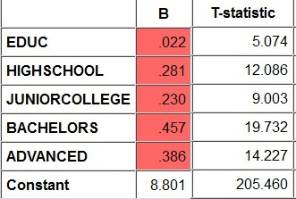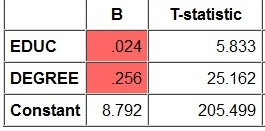 Next, I added DEGREE to the explanatory variables. Degree=0 if you don’t have a high school diploma, =1 if you have only a high school diploma, =2 if you have an associate degree, =3 if you have a bachelor’s degree, and =4 if you have a graduate degree. Result: