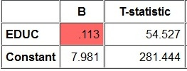 As a benchmark, I started by just regressing log earnings (REALRINC) on years of education. The result: